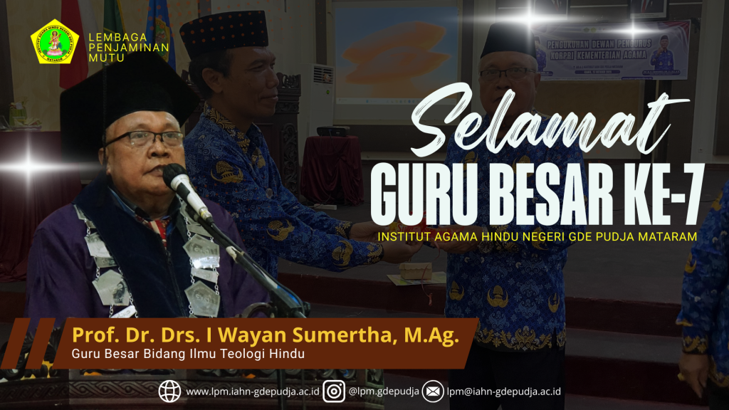 Institut Agama Hindu Negeri (IAHN) Gde Pudja Mataram kembali menorehkan prestasi akademik membanggakan dengan bertambahnya satu lagi Guru Besar di lingkungan kampus. Prof. Dr. Drs. I Wayan Sumertha, M.Ag. secara resmi menerima SK dari Menteri Agama Republik Indonesia Nomor 201040/MA/KP.07.6/09/2025 Tentang Kenaikan Jabatan Fungsional Dosen, yakni Guru Besar Bidang Ilmu Teologi Hindu dan akan dikukuhkan pada 10 November 2025 esok. Ini menjadikannya sebagai Guru Besar ke-7 di IAHN Gde Pudja Mataram.